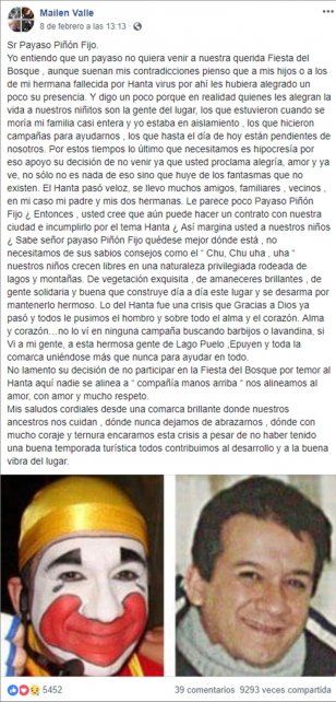 Según la joven mujer (nacida en Epuyén y residiendo desde varios años en Lago Puelo), "entiendo que no quiera venir a nuestra querida Fiesta del Bosque, aunque tengo mis contradicciones: a mis hijos o a los de mi hermana fallecida por hantavirus les hubiera alegrado un poco su presencia. Y digo un poco, porque en realidad quienes alegran la vida a nuestros niñitos es la gente del lugar, los que estuvieron cuando se moría mi familia casi entera y yo estaba en aislamiento; los que hicieron campaña para ayudarnos y hasta el día de hoy están pendientes de nosotros".