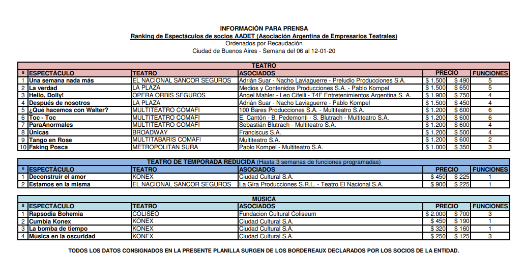 La Asociación Argentina de Empresarios Teatrales (AADET) difundió las posiciones de las obras teatrales agremiadas. Cabe destacar que no están en registro las obras que no están adheridas a la entidad.