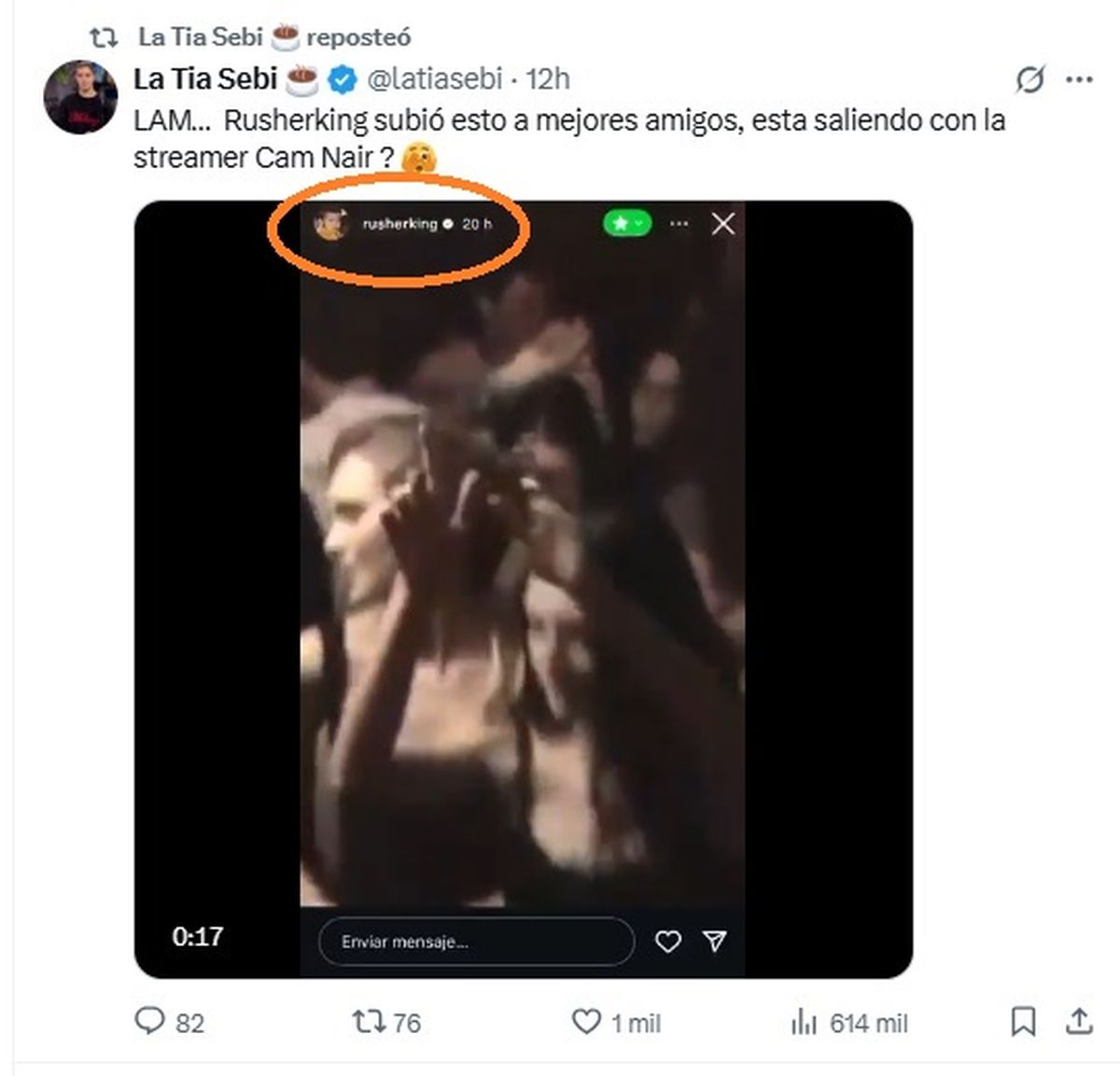 Así, en la red social X (ex Twitter), el usuario La Tía Sebi compartió un clip y le consultó a Ángel de Brito: “LAM... Rusherking subió esto a mejores amigos (en Instagram). ¿Está saliendo con la streamer Cam Nair?”.
