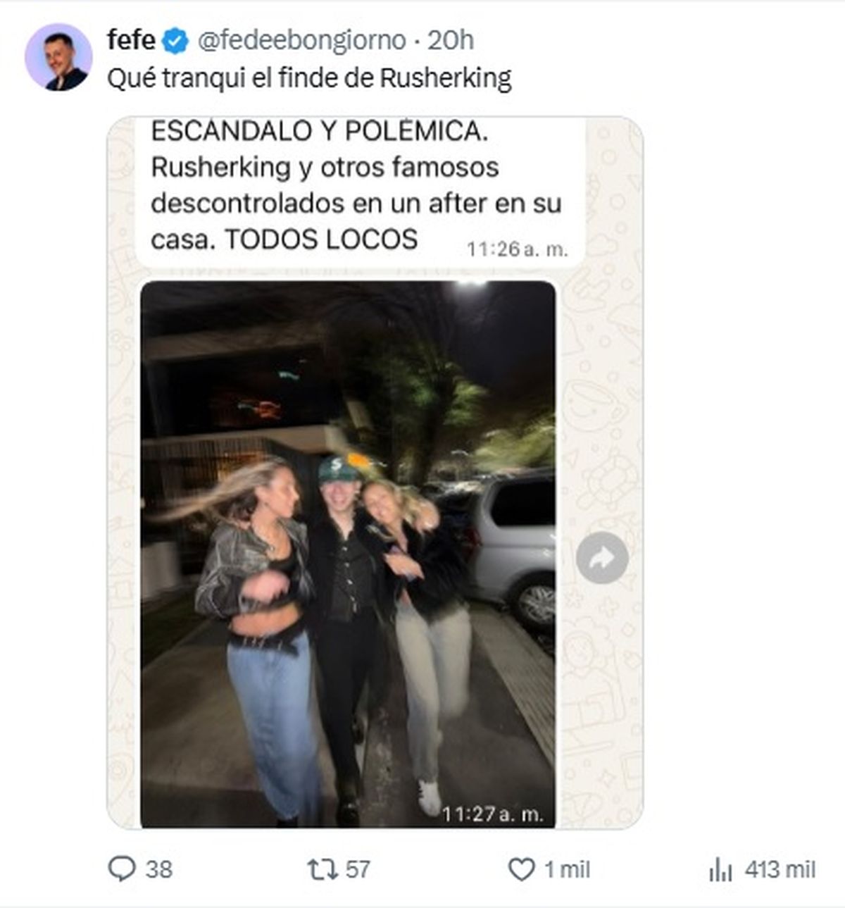 En tanto, Fede Bongierno también compartió otra postal de Rusherking abrazado a dos chicas, y deslizó picante: “Qué tranqui el finde de Rusherking”, así como también publicó el mensaje de WhatsApp que le hicieron llegar con la delatora fotografía que reza: “Escándalo y polémica. Rusherking y otros famosos, descontrolados en un after en su casa. Todos locos”.
