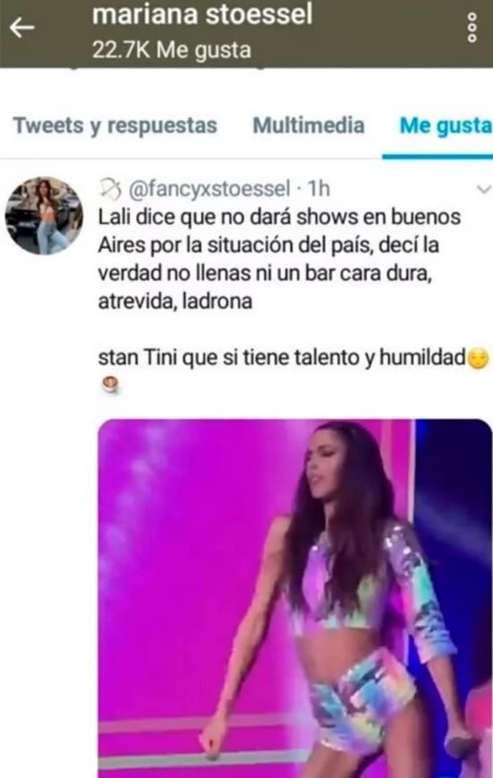 “Disculpá, no es lo que pienso. Vi el video de Tini bailando y no leí lo que decía. No pienso eso de Lali ni de nadie. Mi intención no es ofender”, expresó la madre de Tini.