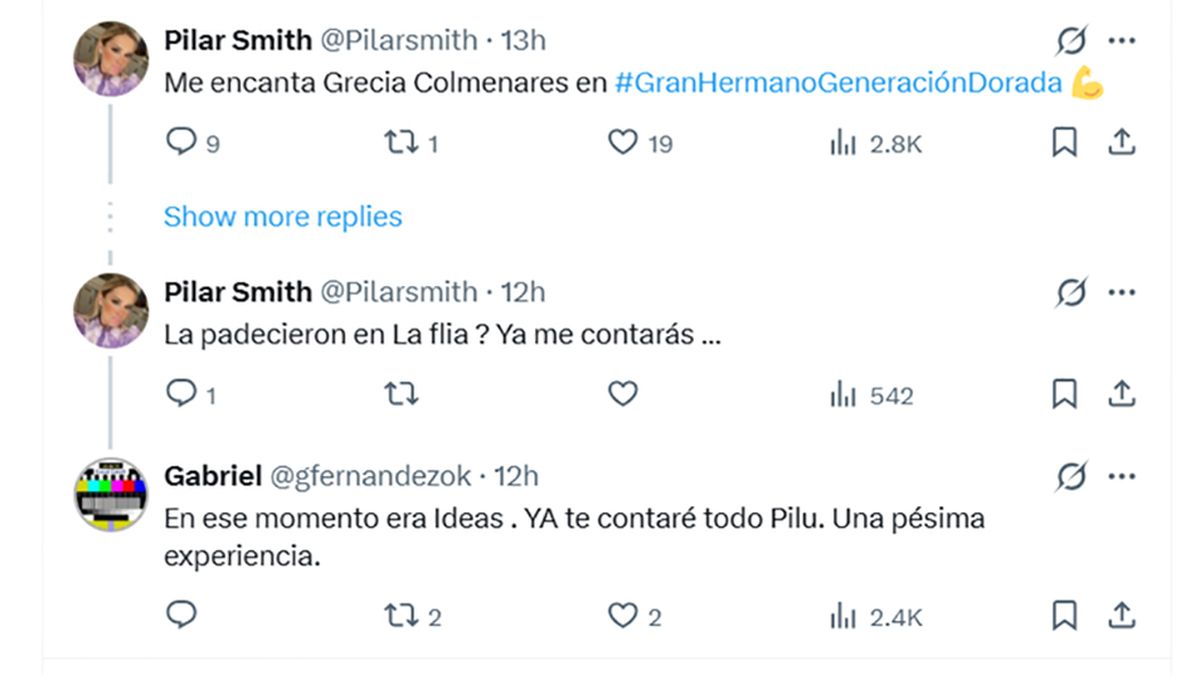 Fernández, un productor del Bailando, trabajó con decenas de figuras del espectáculo y conoce de cerca las exigencias de cada una. Entre ellas estuvo Colmenares, y al parecer, la experiencia no fue la mejor. Su reacción en X fue tajante: “No saben la que les espera”. Y cuando Pilar Smith le consultó si había atravesado situaciones difíciles, respondió: “Ya te contaré todo Pilu. Una pésima experiencia”.