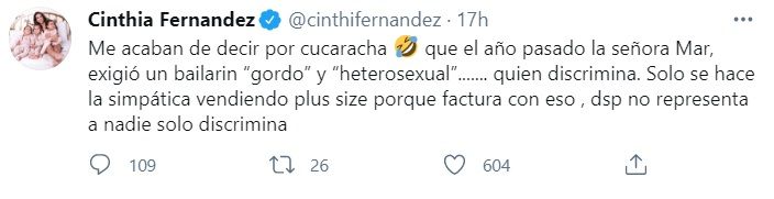 "Me cuentan por cucaracha que el año pasado la señora Mar, exigió un bailarín "gordo" y "heterosexual"... ¿Quién discrimina? Sólo se hace la simpática vendiendo plus size porque factura con eso, después no representa a nadie, sólo discrimina", expresó la panelista de "LAM".