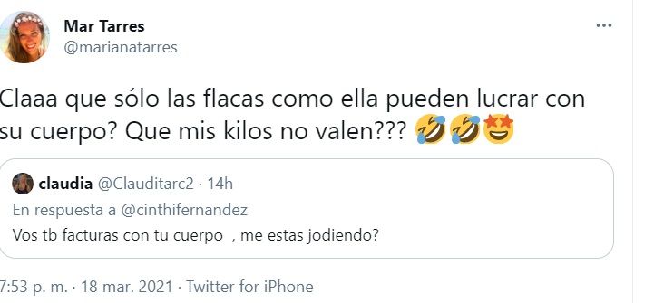 Al ver esa frase, Tarrés compartió el mensaje de una seguidora hacia Fernández y le respondió sin mencionarla: "¿Claaro que sólo las flacas como ella pueden lucrar con su cuerpo? ¿Mis kilos no valen?".