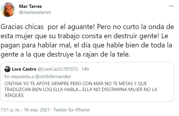 Y luego agradeció los mensajes que le fueron llegando de apoyo de sus seguidores: "¡Gracias chicas por el aguante! Pero no curto la onda de esta mujer que su trabajo consta en destruir gente. Le pagan para hablar mal, el día que hable bien de toda la gente a la que destruye la rajan en la tele", expresó Mar.