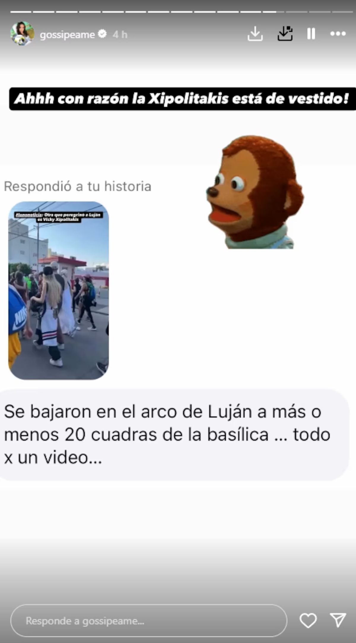 De esta manera, tras compartir en sus Instagram Stories una imagen de Vicky caminando con gorrita y mochila negra entre la multitud, un internauta le respondió avisándole que "se bajaron en el arco de Luján a más o menos 20 cuadras de la Basílica... todo por un video", la también panelista de Puro Show (El Trece).