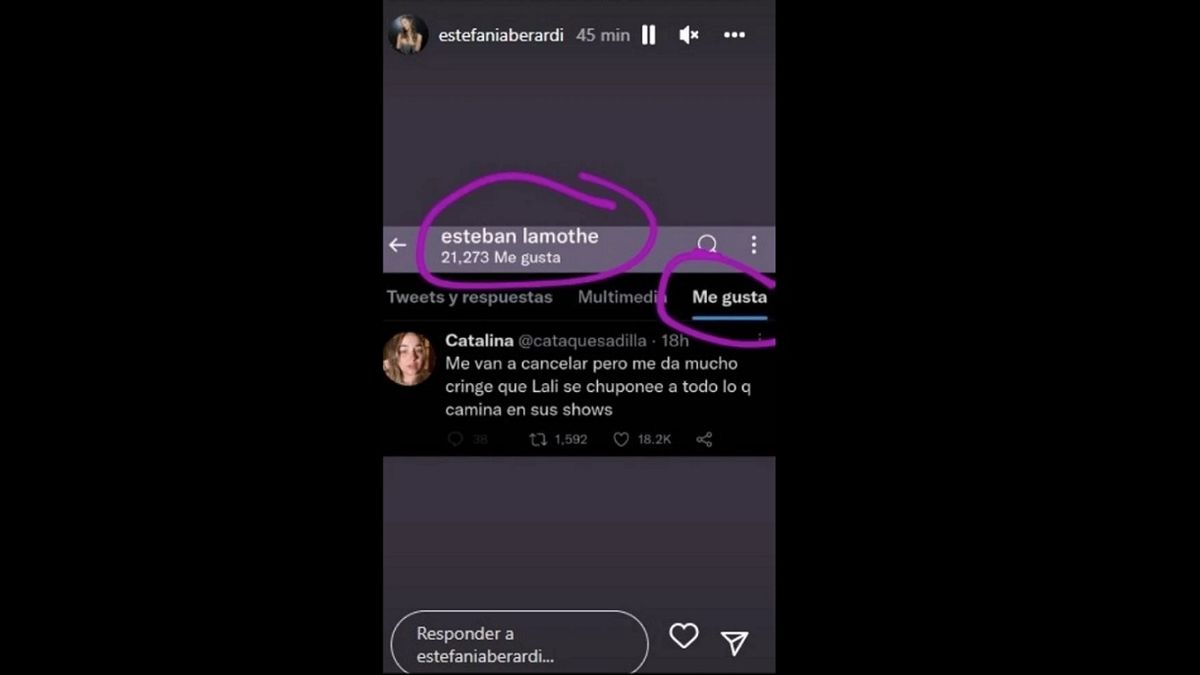 "Me van a cancelar, pero me da mucho cringe que Lali se chuponee a todo lo que camina en sus shows", fue el tweet al que Esteban Lamothe le dio me gusta y que Estefanía Berardi logró capturar.