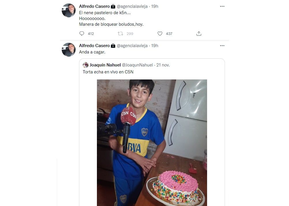 Luego de ese polémico tuit, Alfredo Casero se volvió a referir al tema con otro mensaje:"El nene pastelero de k5n... Hoooooo. Manera de bloquear boludos, hoy".