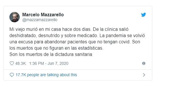 "Mi viejo murió en mi casa hace dos días. De la clínica salió deshidratado, desnutrido y sobre medicado. La pandemia se volvió una excusa para abandonar pacientes que no tengan COVID. Son los muertos que no figuran en las estadísticas. Son los muertos de la dictadura sanitaria", expresó indignado.