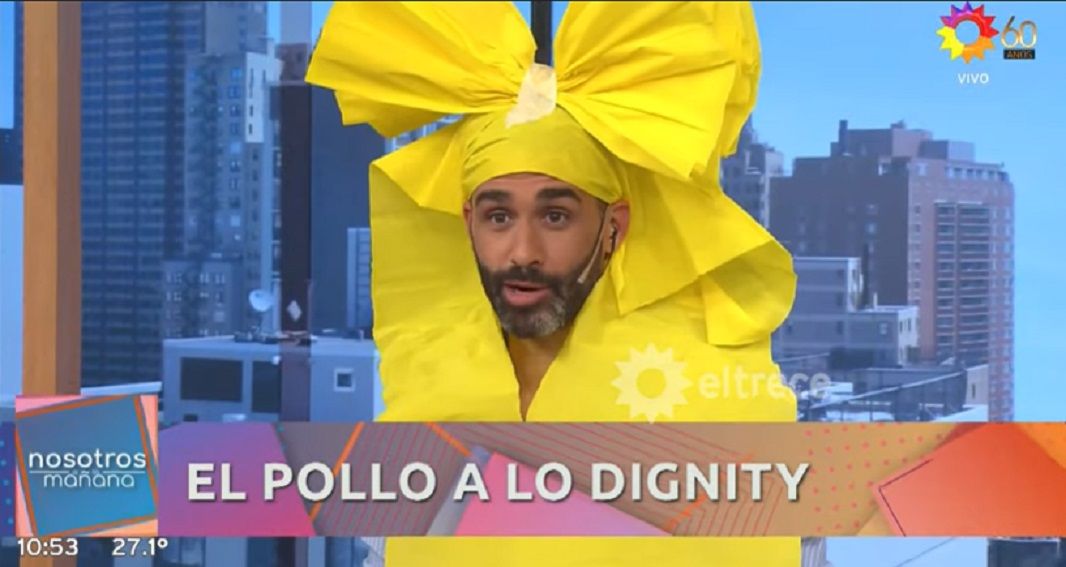 Hace unos días, Joaquín "El Pollo Álvarez" se vistió de Calu "Dignity" Rivero en vivo en "Nosotros a la mañana", El Trece.