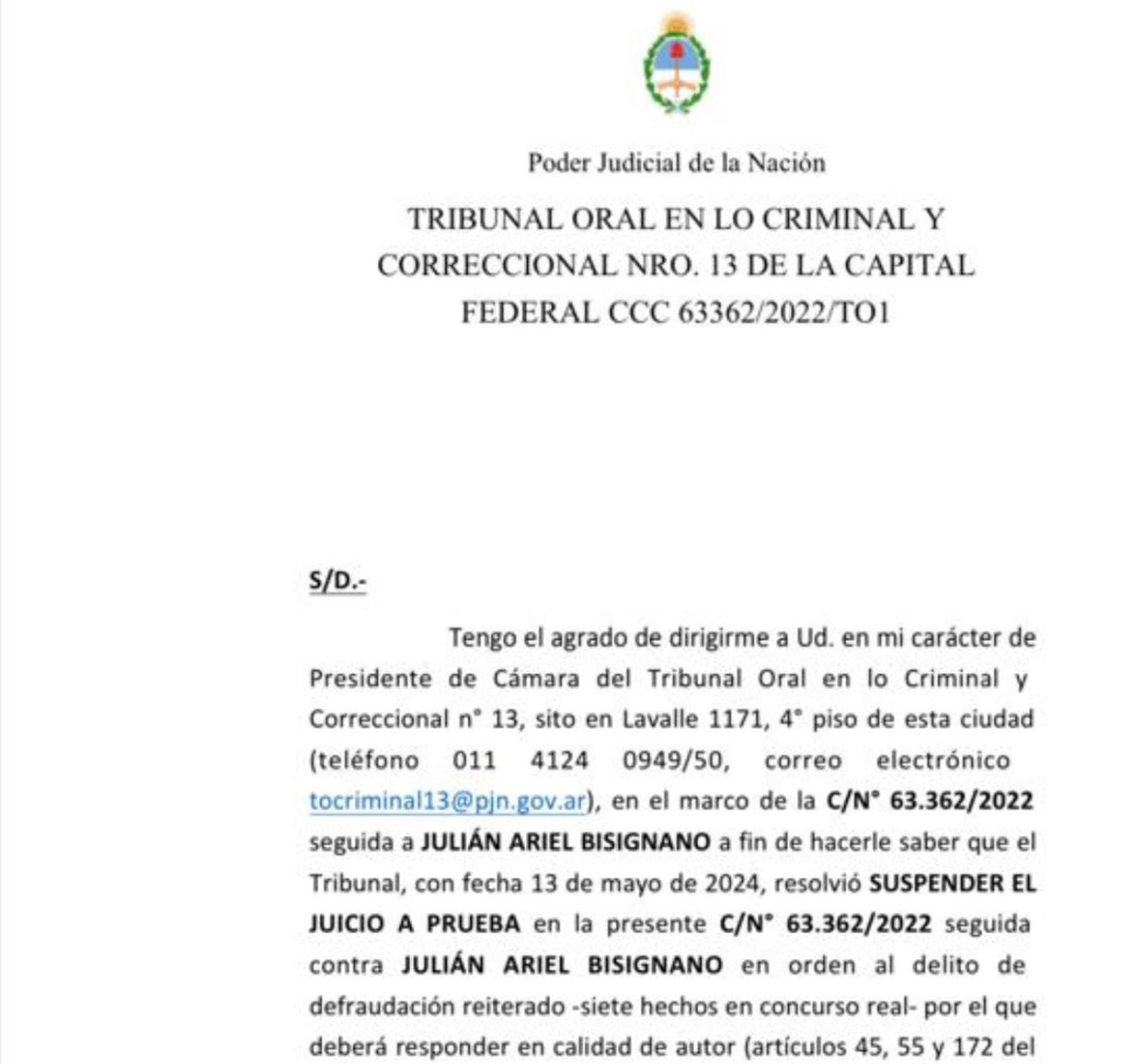Recientemente, la Cámara del Tribunal Oral en lo Criminal y Correccional Nro 13, confirmó que decidió suspender el juicio a prueba por considerar que el reparo económico propuesto y posteriormente efectivizado por Bisignano, fue suficiente como para suspender el litigio.
