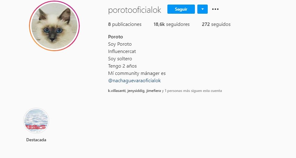 "Influencercat, soy soltero, tengo dos años", reza la descripción del perfil del animal.En el perfil, el animal se describe como "hijo" de Nacha y ya cuenta con más de 18 mil seguidores.Video: Buenos Días América. Embed