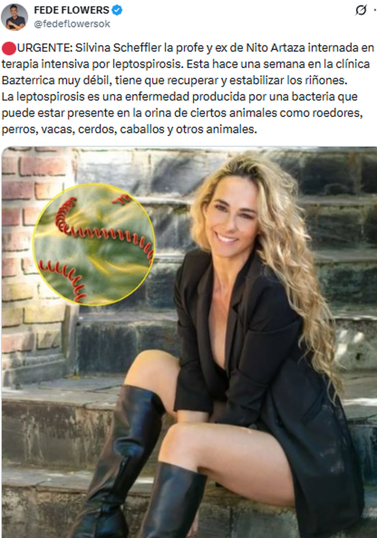 “La profe y ex de Nito Artaza está internada en terapia intensiva por leptospirosis. Hace una semana que se encuentra en la Clínica Bazterrica, muy débil, y debe recuperar y estabilizar los riñones”, escribió, encendiendo las alarmas.