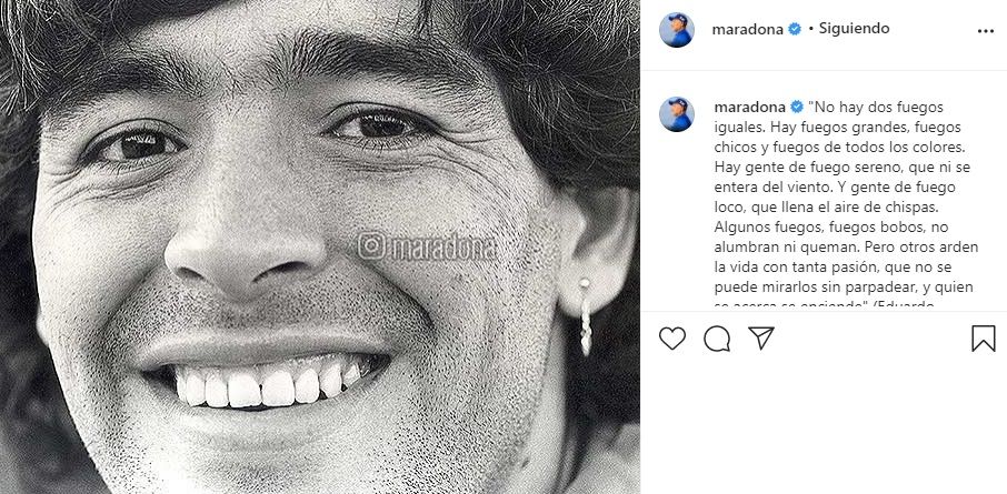 En el feed de Diego Maradona apareció un retrato en blanco y negro de él, muy lindo, al que coronaron con una significativa reflexión del escritor uruguayo Eduardo Galeano.