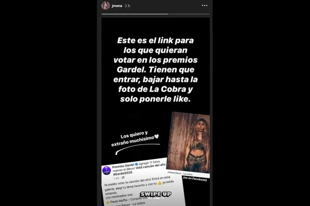 "Este es el link para los que quieran votar en los premios Gardel. Tienen que entrar, bajar hasta la foto de La Cobra y sólo ponerle like", señaló en su stories de Instagram. Y luego, destacó: "Los quiero y extraño muchísimo".