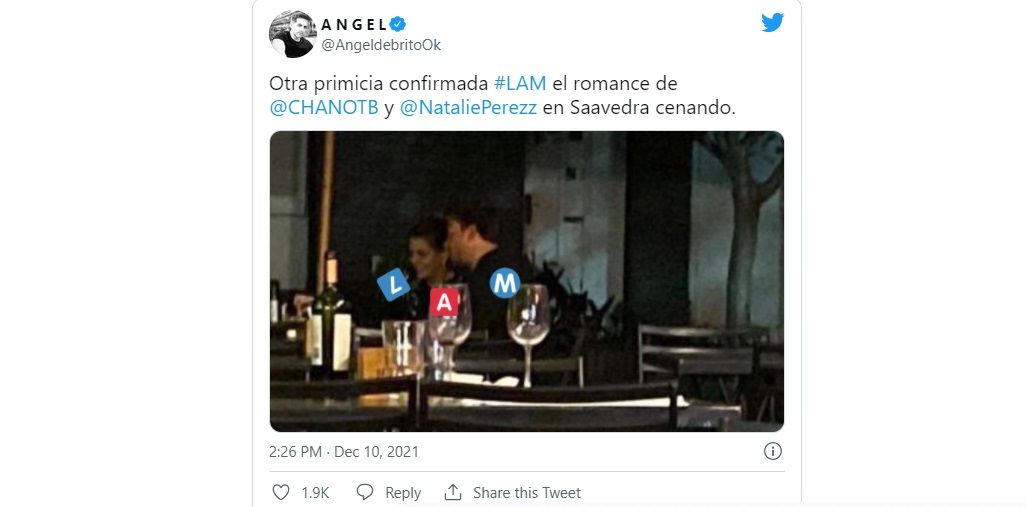Así, ante la consulta del periodista del citado medio: "¿Viniste sólo Chano? ¿Y Natalie? Se dice que estás con Natalie Pérez ¿Es cierto eso o no? ¿Podemos confirmarlo?", y Chano Moreno Charpentier deslizó -mientras le firmaba autógrafos a las fanáticas que lo esperaban en el lugar-: "No lo sé... confirmar no, pero bue... Decir no se puede...".