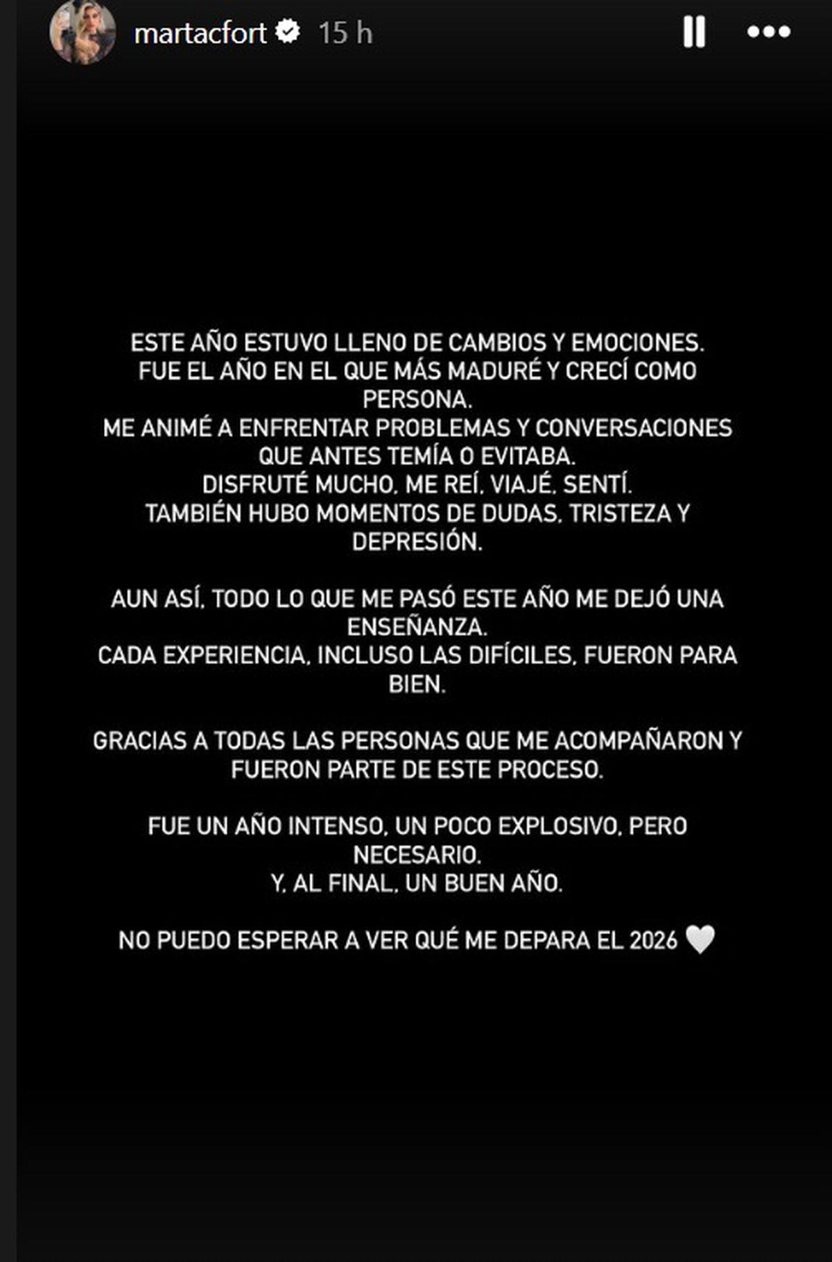 Marta Fort compartió el fin de semana desde su cuenta en Instagram un balance de lo que fue su año 2025 a pocos días de llegar el Año Nuevo.