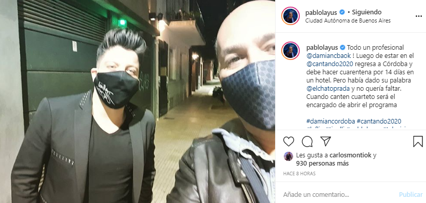 "Todo un profesional @damiancbaok ! Luego de estar en el @cantando2020 regresa a Córdoba y debe hacer cuarentena por 14 días en un hotel. Pero había dado su palabra @elchatoprada y no quería faltar. Cuando canten cuarteto será el encargado de abrir el programa", expresó Layús.