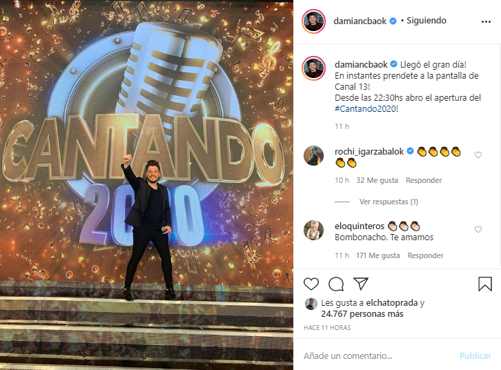 El artista, feliz por la convocatoria, puso en su cuenta de Instagram: "Llegó el gran día! En instantes prendete a la pantalla de Canal 13! Desde las 22:30hs abro el apertura del #Cantando2020!".