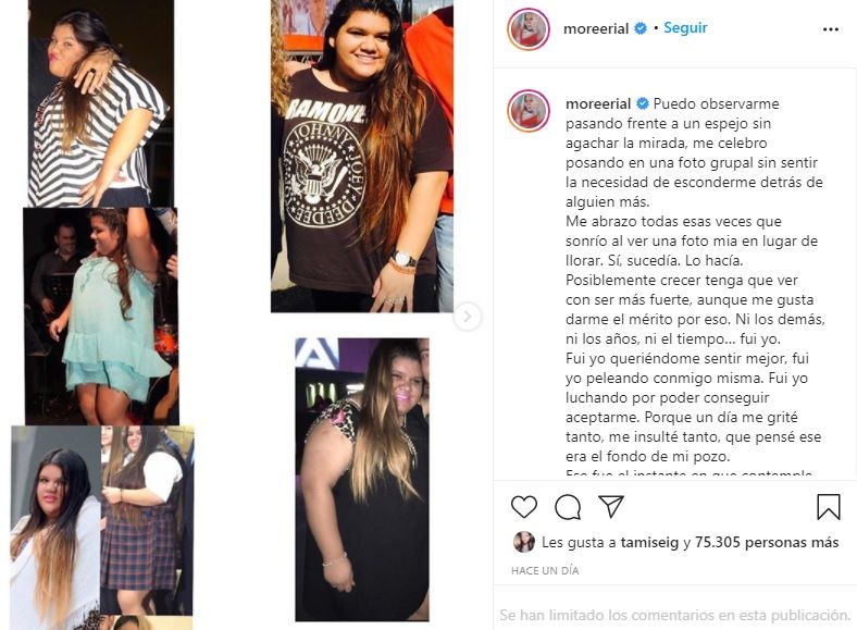 "Que si me costó? Aún estoy recorriendo el camino, aún me doy una palmada en la espalda susurrándome que puedo hacerlo mejor. Pero me susurro con amor, me hablo con compresión, me abrazo con respeto. No puedo aceptar responsabilidad por aquellos que exteriorizan mierda impunes detrás de una pantalla, porque considero que hablar es mucho más fácil que luchar, que opinar sobre la vida de los demás toma menos esfuerzo que ocuparse de la propia, pero me encuentro en la vereda que deseo. Esa que me hace sentir superior por poder hacer silencio frente a aquello que no me compete y pudiendo elegir elogiar aquellos frutos de esas guerras que no vemos y la mayoría de nosotros pasa", enfatizó More.