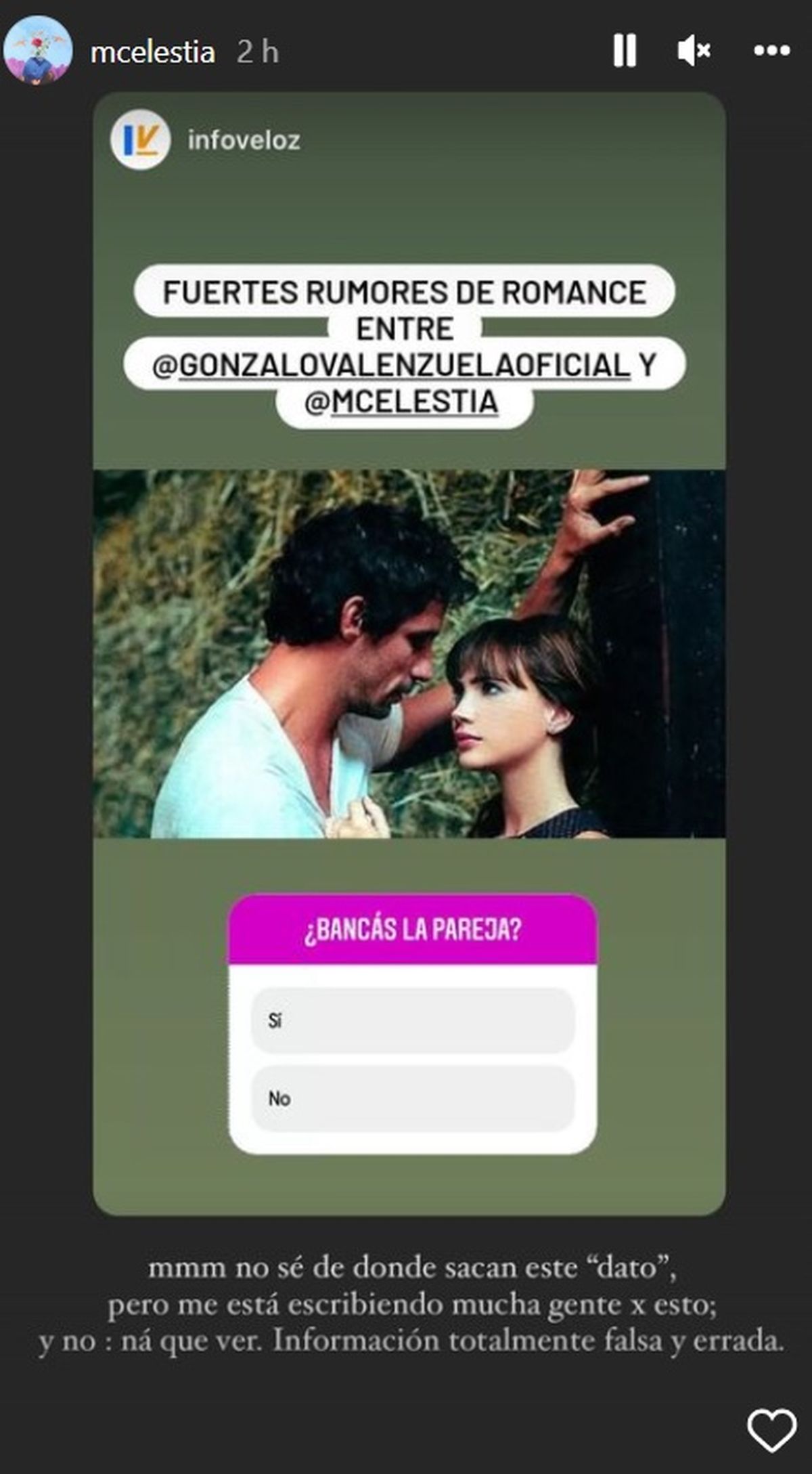 Luego de que este lunes, el periodista Guido Záffora revele en Es por Ahí (América) que Gonzalo Valenzuela está viviendo un historia de amor en secreto con Celeste Cid, la actriz salió a desmentir el vínculo romántico.