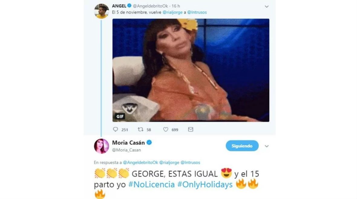 La actriz, en tanto, respondió ese mensaje casi al instante: "George, estás igual. Y el 15 parto yo. #NoLicencia #OnlyHolidays (No de licencia, solo vacaciones)".
