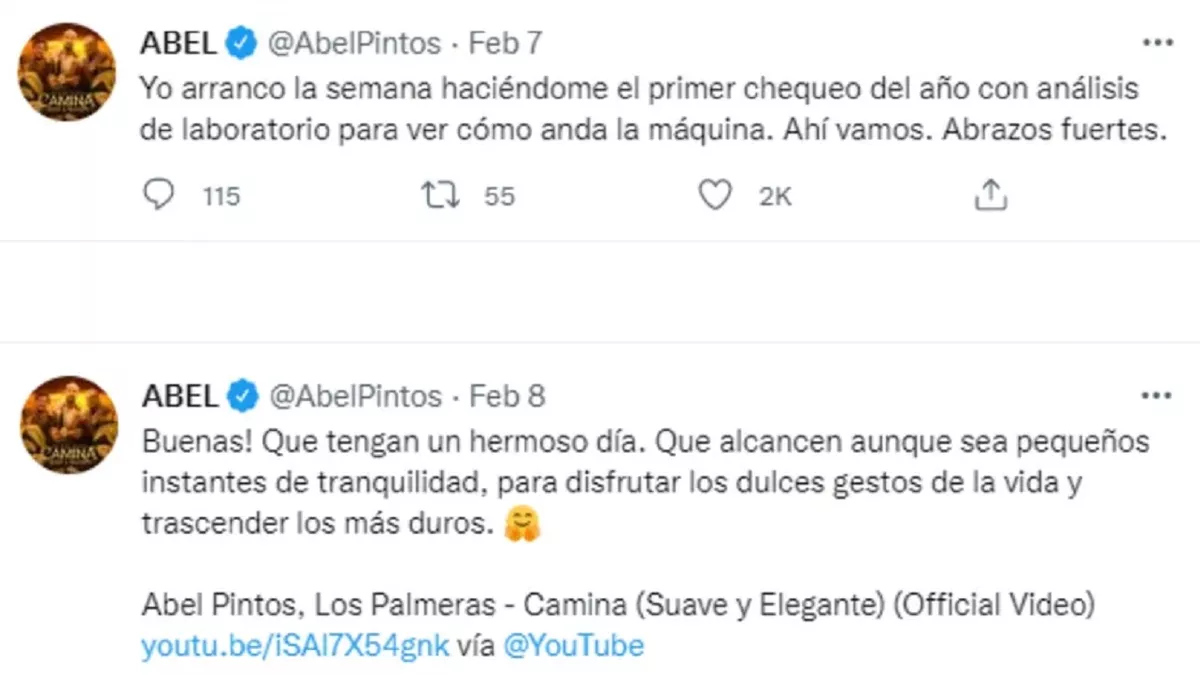 A través de un mensaje en su cuenta de Twitter, Abel contó que se hará unos exámenes de laboratorio. “Yo arranco la semana haciéndome el primer chequeo del año con análisis de laboratorio para ver cómo anda la máquina. Ahí vamos. Abrazos fuertes", comentó Pintos.