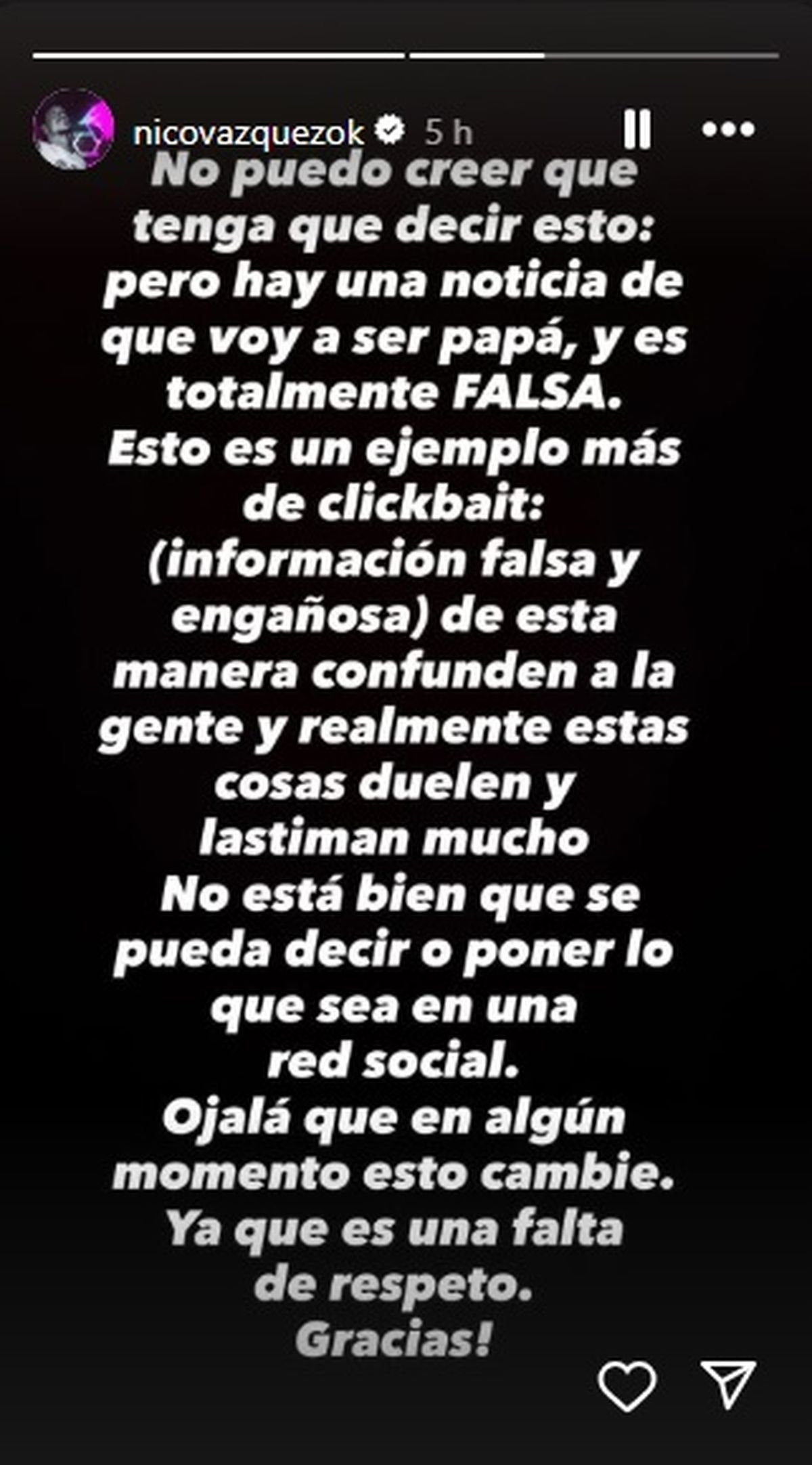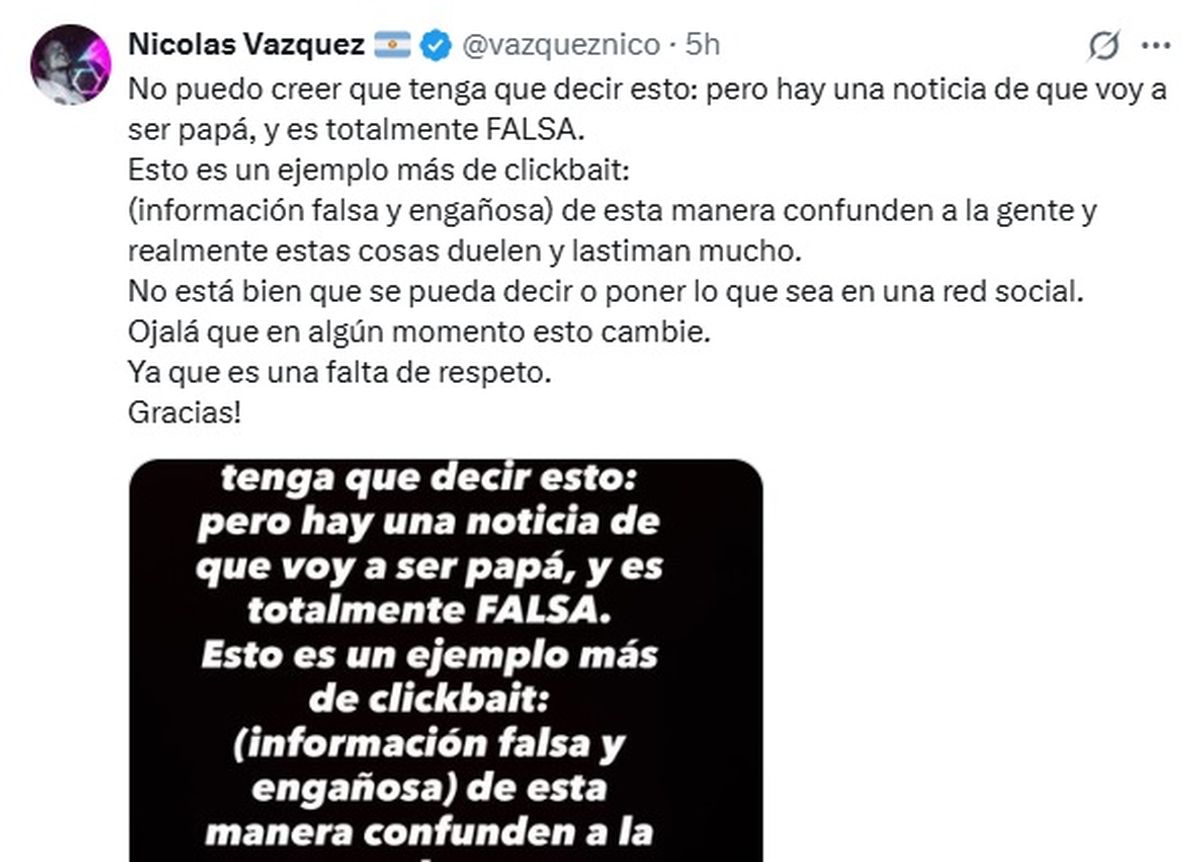 La repercusión fue tal que Nicolás Vázquez decidió romper el silencio. En plena madrugada de este viernes, utilizó sus redes sociales para desmentir categóricamente la versión: “No puedo creer que tenga que decir esto: pero hay una noticia de que voy a ser papá, y es totalmente FALSA. Esto es un ejemplo más de clickbait: (información falsa y engañosa). De esta manera confunden a la gente y realmente estas cosas duelen y lastiman mucho. No está bien que se pueda decir o poner lo que sea en una red social. Ojalá que en algún momento esto cambie. Ya que es una falta de respeto. Gracias!”, escribió en sus Instagram Stories y luego replicó en X -antes Twitter-.