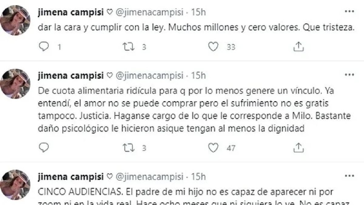"No es capaz ni de proponer una cuota alimentaria digna para Milo. Tuvieron que citar a los abuelos y tampoco quisieron aparecer. Soporté 8 años... De cuota alimentaria ridícula para que por lo menos genere un vínculo. Ya entendí, el amor no se puede comprar pero el sufrimiento no es gratis tampoco... Justicia. Háganse cargo de lo que le corresponde a Milo. Bastante daño psicológico le hicieron asique tengan al menos la dignidad. Dar la cara y cumplir con la ley. Muchos millones y cero valores. Que tristeza", descargó en la red social del pajarito.