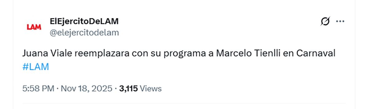 Mientras tanto, la incógnita sobre quién tomaría la posta fue despejada por El Ejército de LAM. A través de X, confirmaron: "Juana Viale reemplazará con su programa a Marcelo Tinelli en Carnaval". De esta manera, la actriz y conductora será la encargada de ocupar el horario del programa de Tinelli, Estamos de paso, con su ciclo.