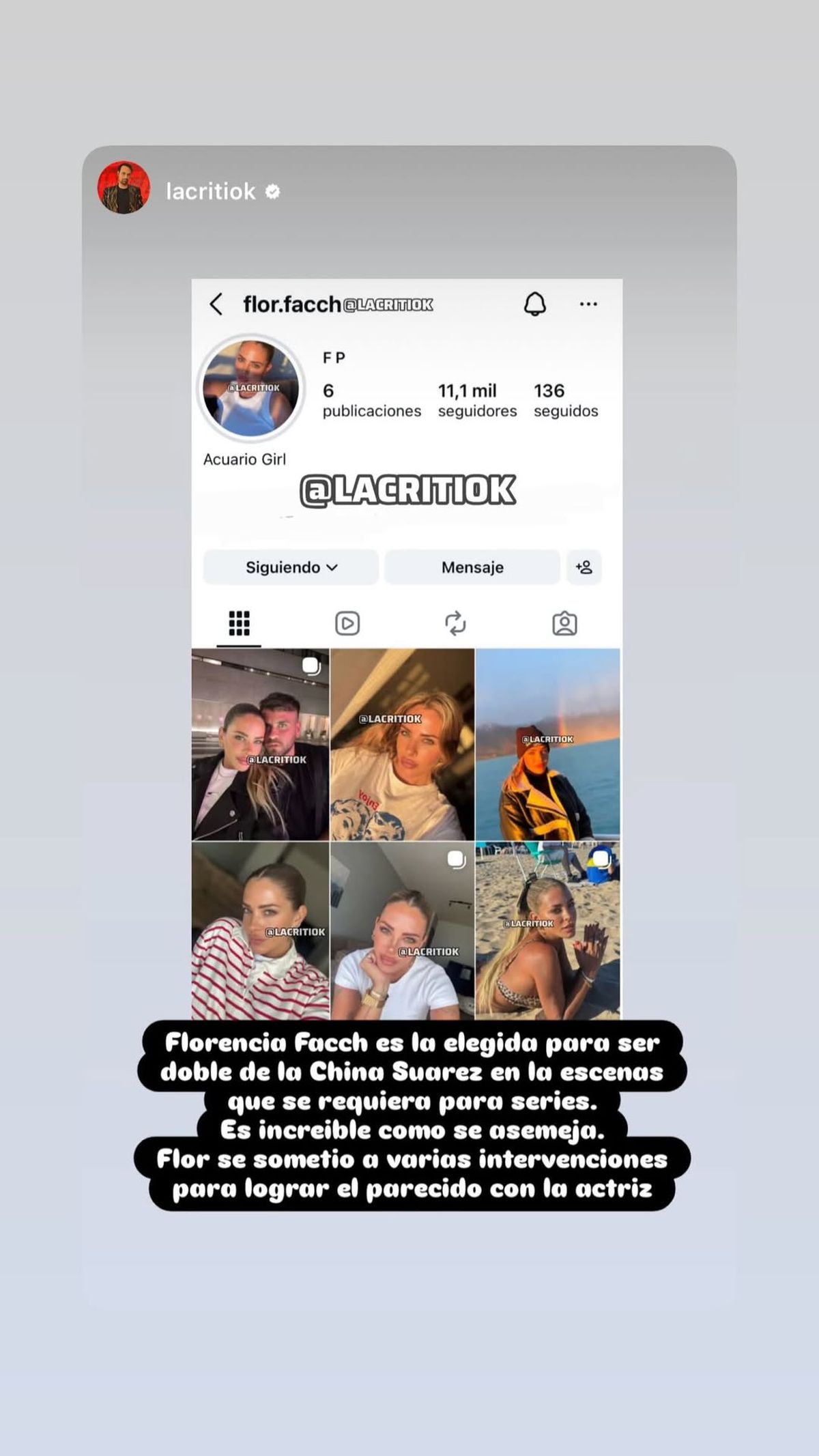 “Florencia Facch es la elegida para ser doble de la China Suarez en la escenas que se requiera para series. Flor se sometió a varias intervenciones para lograr el parecido con la actriz”, contó.