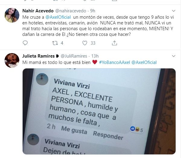 “Me crucé a Axel un montón de veces, desde que tengo 9 años lo vi en hoteles, entrevistas, camarín, avión. NUNCA me trató mal, NUNCA vi un mal trato hacia las personas que lo rodeaban en ese momento, ¡MIENTEN! Y dañan la carrera de él. ¿No tienen otra cosa que hacer?”.