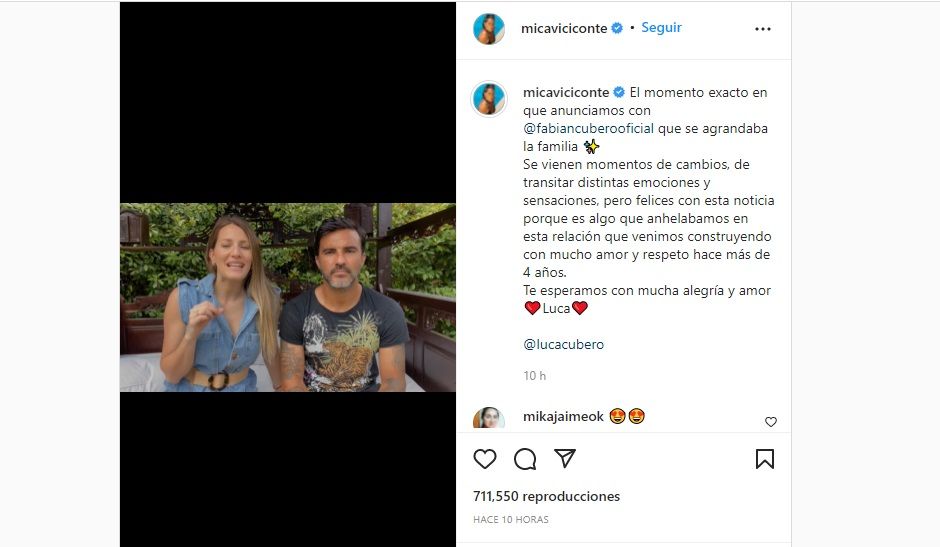 "El momento exacto en que anunciamos con @fabiancuberooficial que se agrandaba la familia", dice Mica en el posteo que acompaña el video. "Se vienen momentos de cambios, de transitar distintas emociones y sensaciones, pero felices con esta noticia porque es algo que anhelábamos en esta relación que venimos construyendo con mucho amor y respeto hace más de 4 años. Te esperamos con mucha alegría y amor, Luca", expresó Mica.