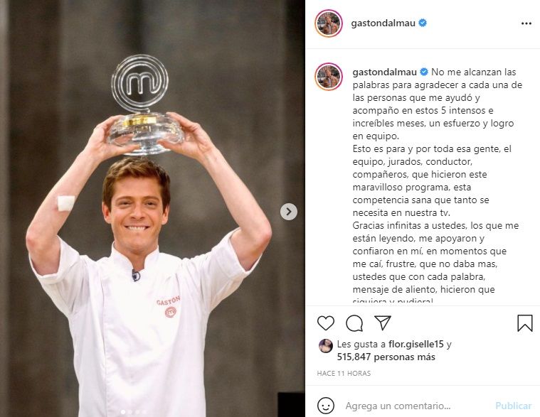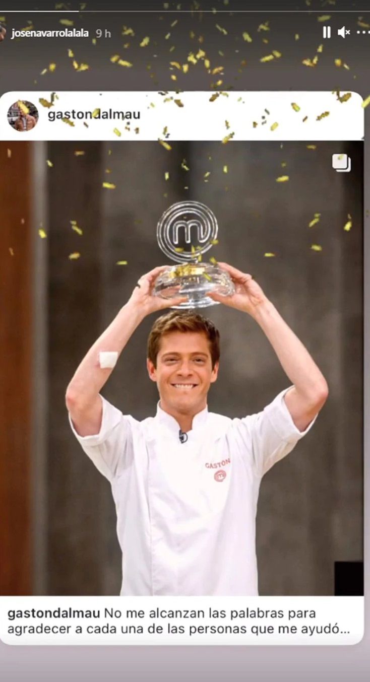 Lo cierto es que el joven español, pareja del actor, se puso contento a la distancia con la consagración de su novio en el reality gastronómico y compartió una historia donde se lo ve a Gastón alzando el preciado trofeo del programa, imagen que había compartido el propio actor en Instagram.