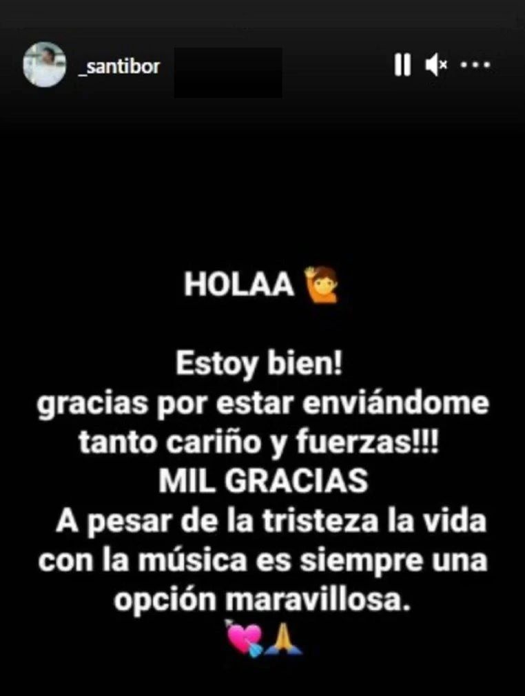 “Hola, estoy bien. ¡Gracias por estar enviándome tanto cariño y fuerzas! Mil gracias. A pesar de la tristeza, la vida con la música es siempre una opción maravillosa”, expresó Borda, de gran aparición en el exitoso reality musical.