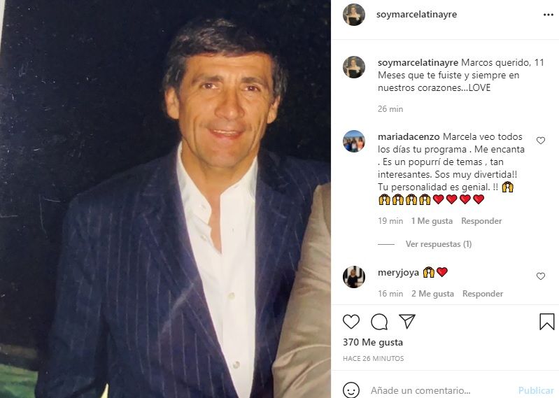 "Marcos querido, 11 meses que te fuiste y siempre en nuestros corazones… LOVE", escribió la conductora en su cuenta de la red social junto con una foto del ex banquero. Se trata de ex marido de Marcela y padre de su hijo Rocco.
