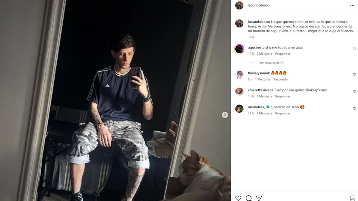 El exdefensor decidió interactuar públicamente por primera vez con una publicación de su hijo mayor, Facundo Bono —a quien reconoció como su primogénito poco antes de la pandemia— y le dejó un “Me gusta” en Instagram. El joven tatuador había compartido una serie de imágenes acompañadas por un profundo mensaje: “Lo que quema por dentro también es lo que alumbra por fuera. Ardo. Me transformo. No busco encajar. Busco encender. Es mi manera de seguir vivo. Y el resto… mejor que lo diga el silencio”.