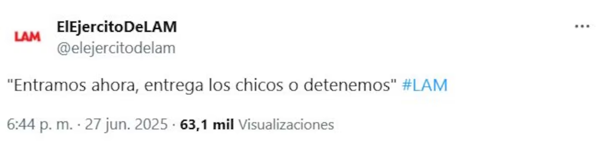 “Entramos ahora, entregá los chicos o detenemos #LAM”, escribieron en la cuenta oficial de X (antes Twitter) @elejercitodelam. Frase por la cual Wanda minutos después cambió su postura y las nenas pudieron irse con su padre.