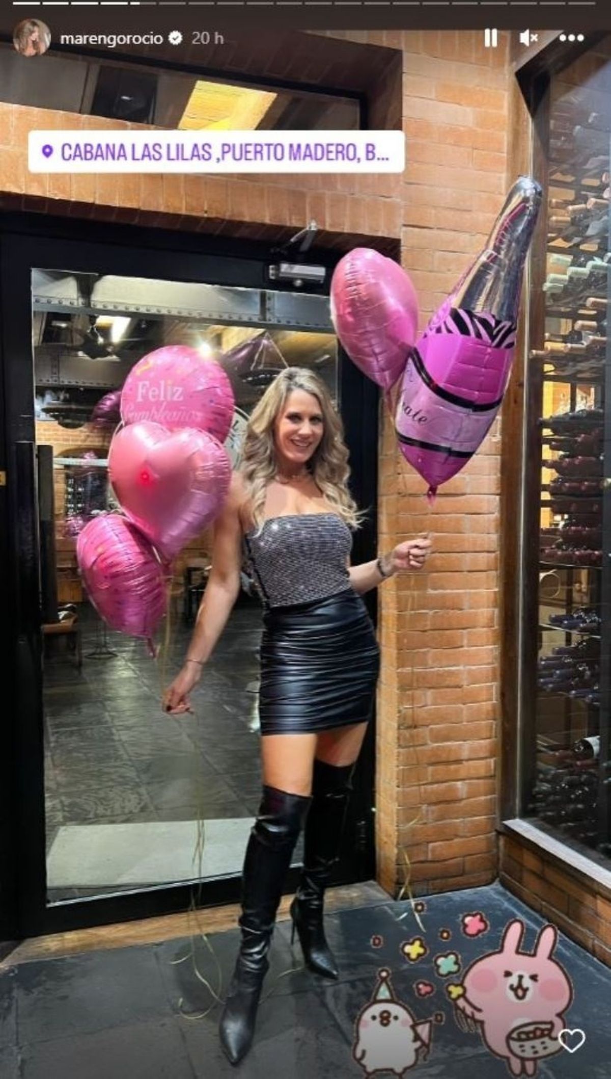 Para su noche, Rocío Marengo eligió un elegante look con una pollera corta de vinilo color negro y bucaneras del mismo color, que combinó con un strapless con apliques de brillos.