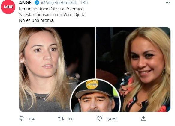 “Renunció Rocío Oliva a Polémica. Ya están pensando en Vero Ojeda. No es una broma”, anunció el conductor de "LAM" en su cuenta de Twitter.