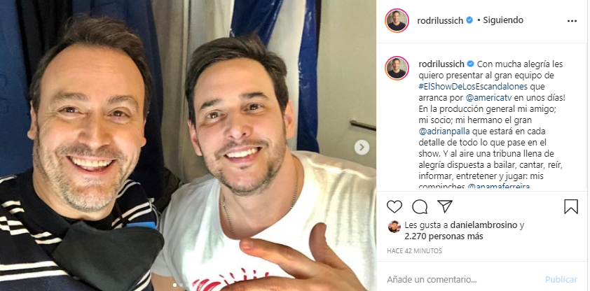 "Con mucha alegría les quiero presentar al gran equipo de #ElShowDeLosEscandalones que arranca por @americatv en unos días! En la producción general mi amigo; mi socio; mi hermano el gran @adrianpalla que estará en cada detalle de todo lo que pase en el show. Y al aire una tribuna llena de alegría dispuesta a bailar, cantar, reír, informar, entretener y jugar: mis compinches @anamaferreira @natijota @juanoterook @sheilagallega", escribió.