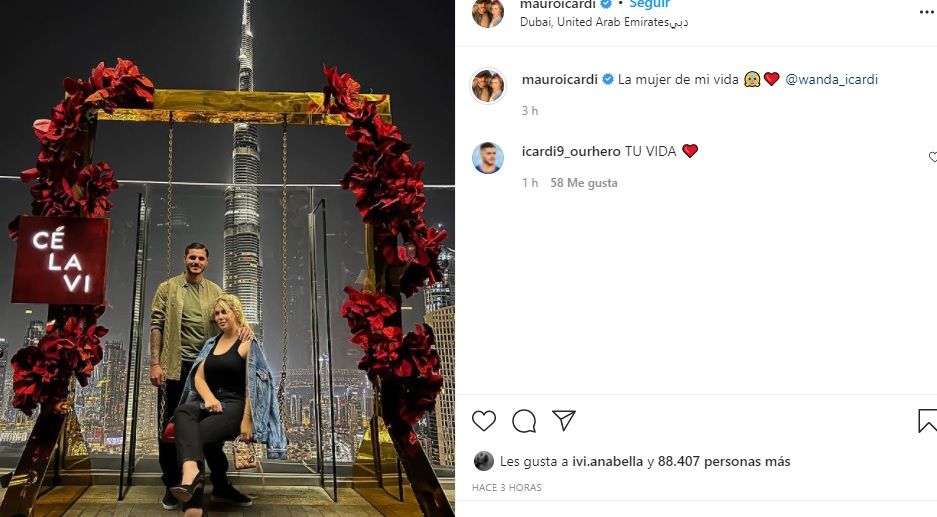 El domingo, Mauro Icardi volvió a reflejar sus sentimientos hacia su mujer y madre de sus hijas Francesca e Isabella, con un romántico posteo: "La mujer de mi vida", expresó el delantero junto a un corazón.