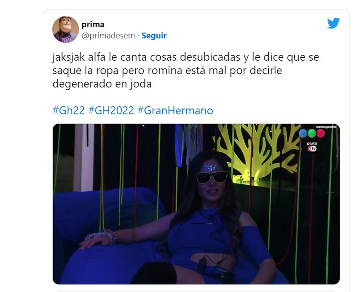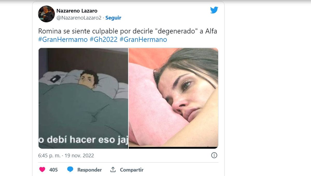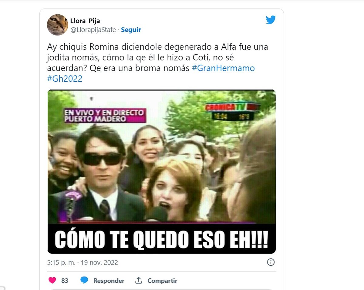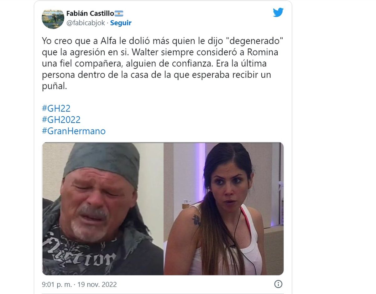 Lo cierto es que en las redes tuvo mucha repercusión este tenso momento entre Alfa y Romina en la casa y se llenó de memes en Twitter apuntando contra la ex diputada y su fuerte frase contra Walter. La mayoría de los mensajes repudió el accionar de Romina contra su compañero.