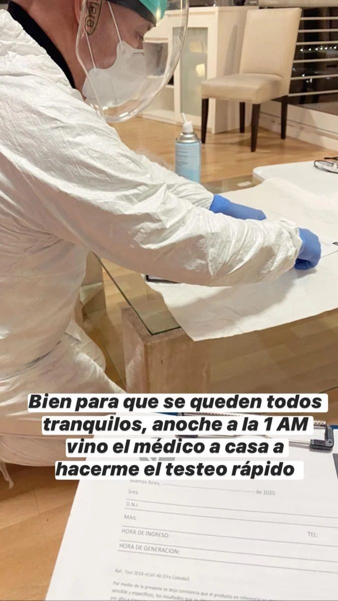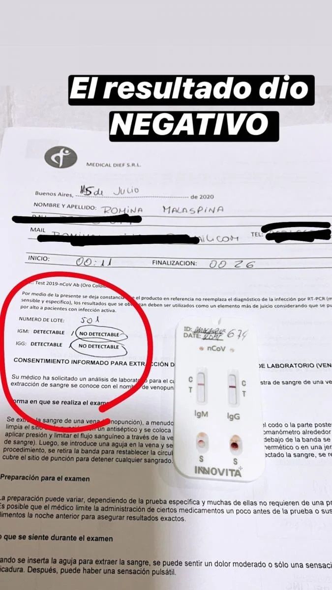 "Bien, para que se queden todos tranquilos, anoche 1 am vino el médico a casa a hacerme rápido el test. El resultado dio negativo", informó Malaspina mostrando la hoja del análisis.