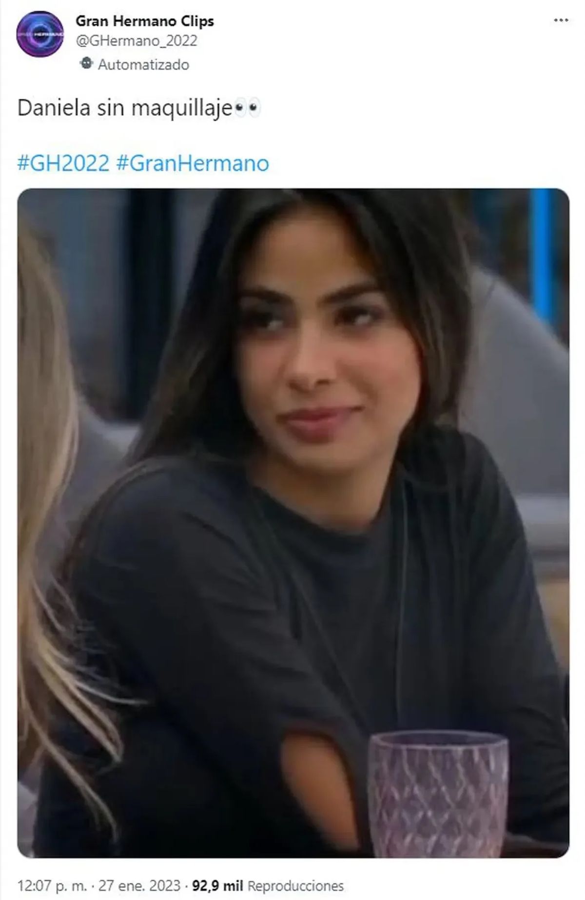 Sin embargo, en las últimas horas, en Twitter se viralizó una imagen inédita de Daniela. En la misma, la figura de GH está al natural, sin una gota de maquillaje, algo muy raro en ella.
