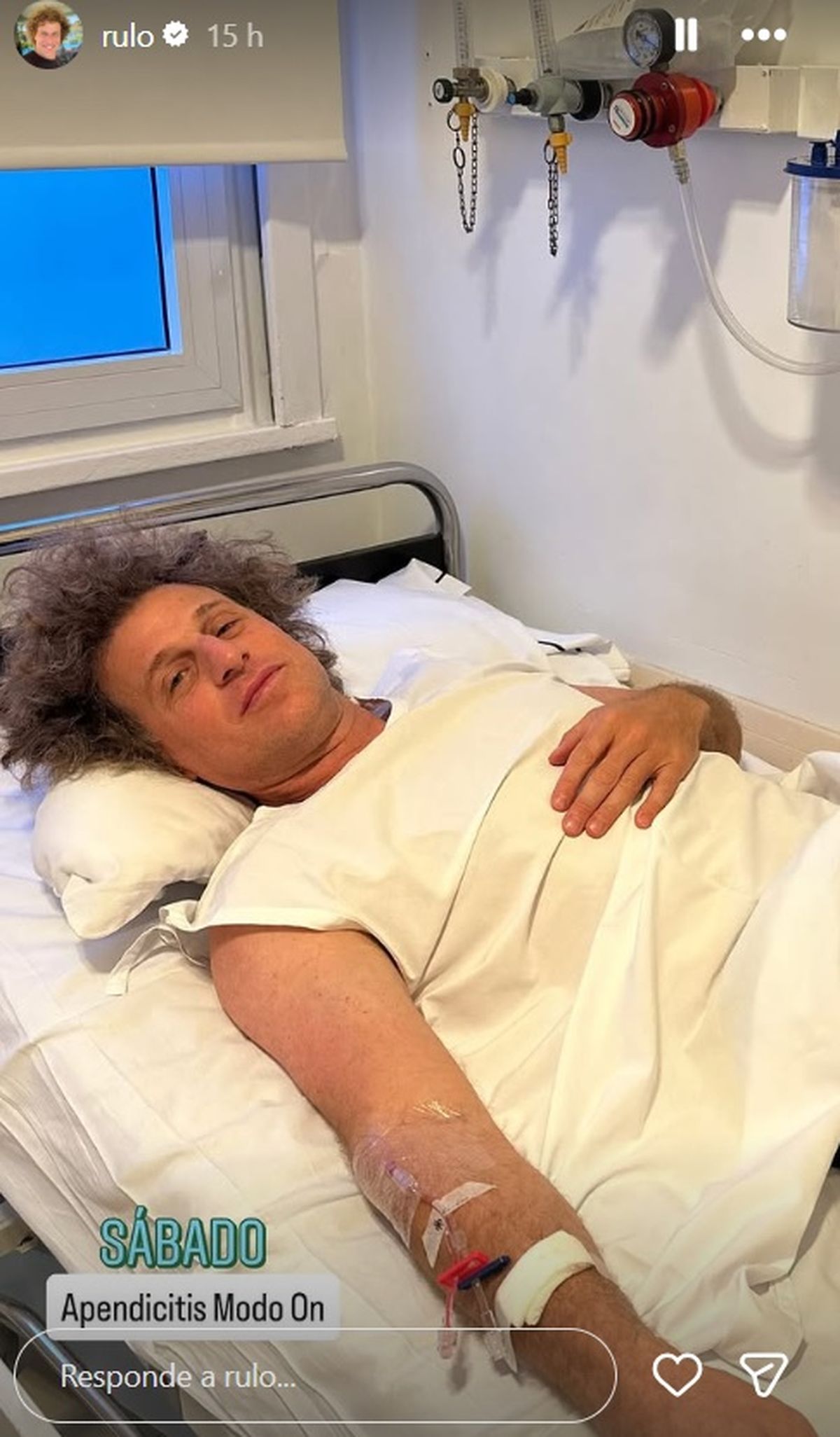 "Sábado, apendicitis modo on", indicó Rulo Schijman en la postal donde se lo ve acostado y ya con el suero colocado tras sufrir un cuadro de apendicitis.