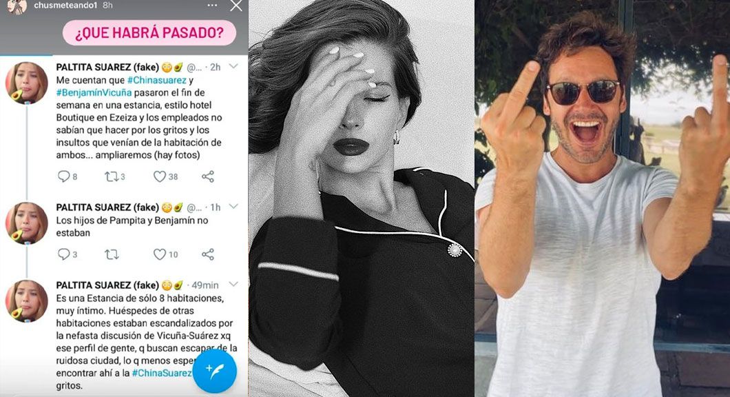 “Pero parece que ‘pasaron cosas’”, escribió y detalló: “Me cuentan que #Chinasuarez y #BenjamínVicuña pasaron el fin de semana en una estancia, estilo hotel Boutique en Ezeiza y los empleados no sabían qué hacer por los gritos y los insultos que venían de la habitación de ambos... ampliaremos (hay fotos)”.