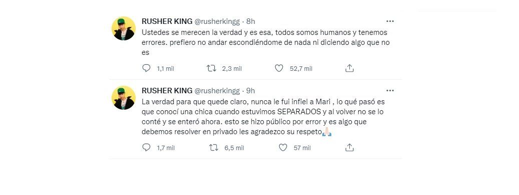 Por su parte, el cantante Rusherking se volcó a Twitter para dar su versión: "La verdad para que quede claro, nunca le fui infiel a Mari , lo qué pasó es que conocí una chica cuando estuvimos SEPARADOS y al volver no se lo conté y se enteró ahora. esto se hizo público por error y es algo que debemos resolver en privado les agradezco su respeto", indicó Rusherking.