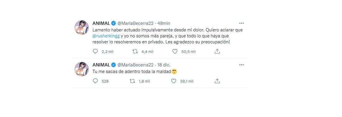 Lo cierto es que el domingo, María Becerra aclaró vía Twitter que no está más en pareja con Rusherking y se refirió al impulso que la llevó a esos fuertes mensajes que luego borró: "Lamento haber actuado impulsivamente desde mi dolor. Quiero aclarar que @rusherkingg y yo no somos más pareja, y que todo lo que haya que resolver lo resolveremos en privado. Les agradezco su preocupación!", expresó la joven artista musical.