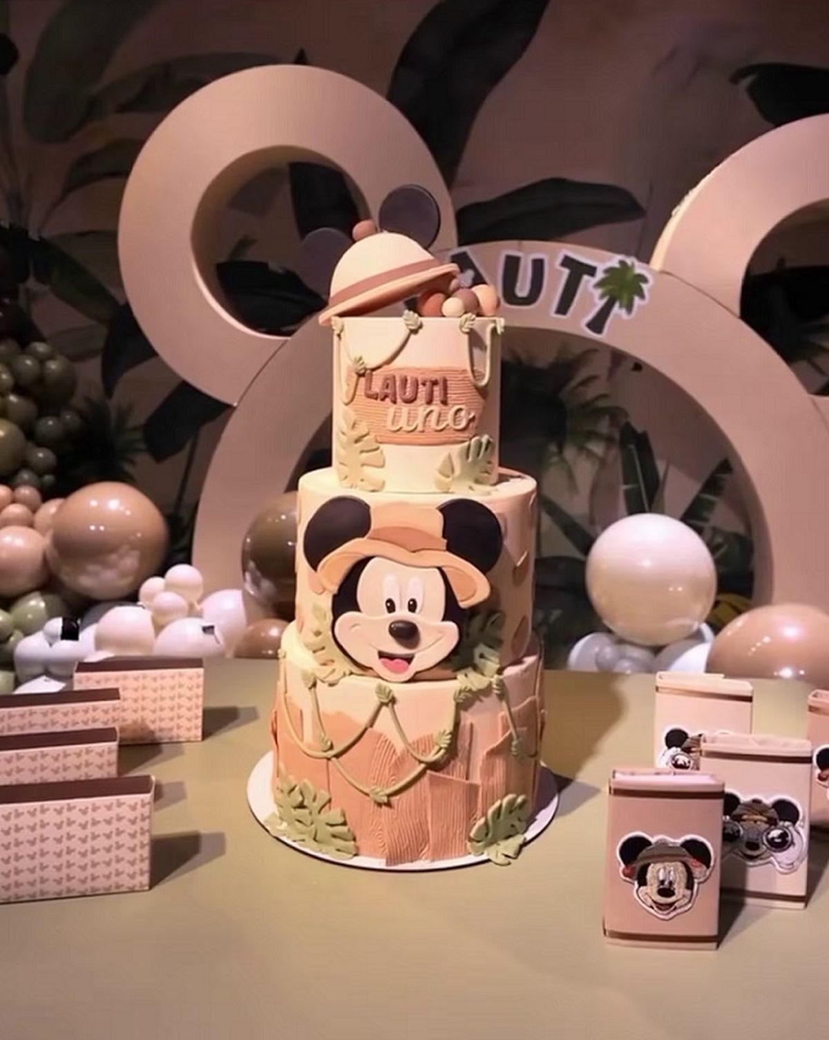 La torta gigante de tres pisos también estuvo orientada a la misma temática mezclando la figura de ramas y la imagen de Mickey.